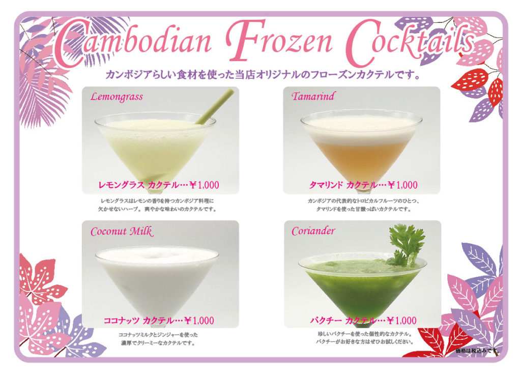 当店オリジナル、カンボジア食材を使った「カンボジアフローズン カクテル」もお試しください。